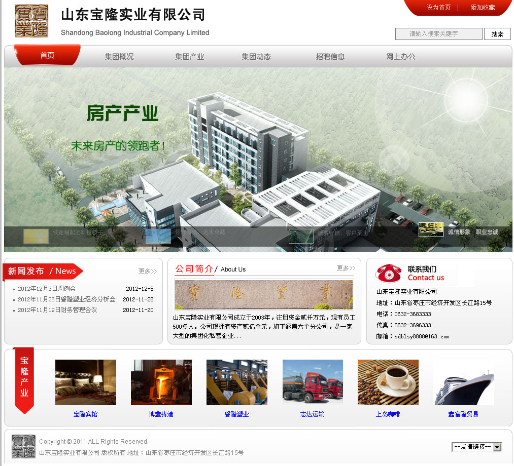 棗莊網(wǎng)站制作:山東寶隆實(shí)業(yè)有限公司成立于2003年,公司注冊(cè)資本金貳仟萬(wàn)元,現(xiàn)有職工500余人。公司現(xiàn)擁有資產(chǎn)叁億余元,旗下涵蓋六個(gè)分公司。 公司總部位于山東省棗莊市工業(yè)園長(zhǎng)江路15號(hào),地處省級(jí)經(jīng)濟(jì)開(kāi)發(fā)區(qū),南臨運(yùn)河,北臨京福高速公路,西距京滬高鐵,距著名的旅游景區(qū)臺(tái)兒莊運(yùn)河古城、微山湖濕地公園均40公里。地理位置優(yōu)越,交通便利,環(huán)境優(yōu)美。 公司是一家以銷(xiāo)售煤炭、石膏、水泥、熟料等建筑材料為主營(yíng)業(yè)務(wù),以生產(chǎn)和經(jīng)營(yíng)耐磨材料、塑編袋、物流運(yùn)輸、化工原料、地?zé)岵牧蠟檩o營(yíng)業(yè)務(wù),同時(shí)經(jīng)營(yíng)房地產(chǎn)行業(yè)的綜合性集團(tuán)化私營(yíng)企業(yè)。公司自成立以來(lái),經(jīng)營(yíng)業(yè)績(jī)穩(wěn)定提升,與中國(guó)聯(lián)合水泥集團(tuán)有限公司(CUCC)、棗莊礦業(yè)集團(tuán)等多家大型企業(yè)建立了長(zhǎng)期穩(wěn)定的戰(zhàn)略合作伙伴關(guān)系。 寶隆實(shí)業(yè)始終秉承著“恪守誠(chéng)信,追求卓越”的經(jīng)營(yíng)理念,以“誠(chéng)實(shí)守信、客戶(hù)至上”為營(yíng)銷(xiāo)宗旨,遵循“平等互利、合作共贏”的原則;以“樹(shù)寶隆形象,創(chuàng)寶隆品牌”為目標(biāo),艱苦奮斗、務(wù)實(shí)創(chuàng)新,公司在激烈的市場(chǎng)競(jìng)爭(zhēng)中表現(xiàn)出巨大的進(jìn)取心,煥發(fā)出蓬勃生機(jī),用誠(chéng)信和實(shí)力創(chuàng)造寶隆曠世偉業(yè),這是寶隆人不懈的追求! 2011年,寶隆實(shí)業(yè)已走過(guò)九年的發(fā)展歷程,九年,在漫長(zhǎng)的歷史長(zhǎng)河中只是短暫的瞬間,但對(duì)于寶隆人來(lái)說(shuō),這是一段永載史冊(cè)、奮發(fā)有為、成就百年基業(yè)的創(chuàng)業(yè)歷程,寶隆人用青春、汗水、和智慧譜寫(xiě)了一曲華彩樂(lè)章。九年的櫛風(fēng)沐雨,九年春華秋實(shí);九載磨礪拼搏,九載碩果累。九年的堅(jiān)守、堅(jiān)韌、堅(jiān)持,所有的積累,所有的沉淀,讓寶隆實(shí)業(yè)增強(qiáng)了實(shí)力和能力,讓寶隆人增添了勇氣和底氣,寶隆實(shí)業(yè)在激烈的市場(chǎng)競(jìng)爭(zhēng)中敢于亮劍,敢于向世界一流巔峰企業(yè)發(fā)起挑戰(zhàn),這是全體寶隆人時(shí)刻保持著的、永遠(yuǎn)都不可磨滅的寶隆意志。 今天,寶隆人在此收拾好往日的榮耀。明天,寶隆人又將迎著朝陽(yáng),帶著堅(jiān)毅的目光,踏上任重道遠(yuǎn)的征程,朝著下一個(gè)光輝楊帆遠(yuǎn)航…… |